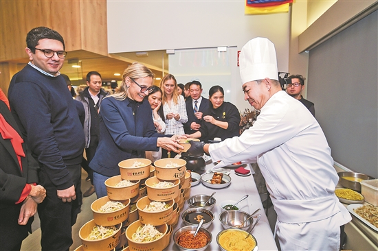 “‘你好,中國’重慶美食走進(jìn)聯(lián)合國旅游組織——‘渝味360碗’美食推介會”近日在位于西班牙首都馬德里的聯(lián)合國旅游組織總部舉行。近百名嘉賓歡聚一堂,共品佳肴,體驗中國的美食文化。圖為人們在美食推介會上品嘗美食。