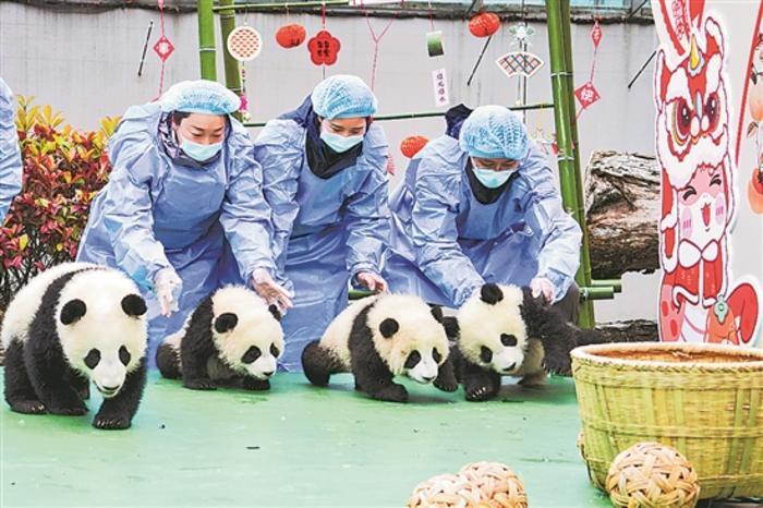 1月23日,大熊貓國(guó)家保護(hù)研究中心的兩大組成機(jī)構(gòu)——中國(guó)大熊貓保護(hù)研究中心(簡(jiǎn)稱熊貓中心)和成都大熊貓繁育研究基地(簡(jiǎn)稱熊貓基地)在四川聯(lián)合舉辦“吉祥如意 萌寶迎新”新春主題活動(dòng),兩家機(jī)構(gòu)的25只2024年出生的大熊貓幼崽在年味十足的氛圍中首次亮相。新華社發(fā)