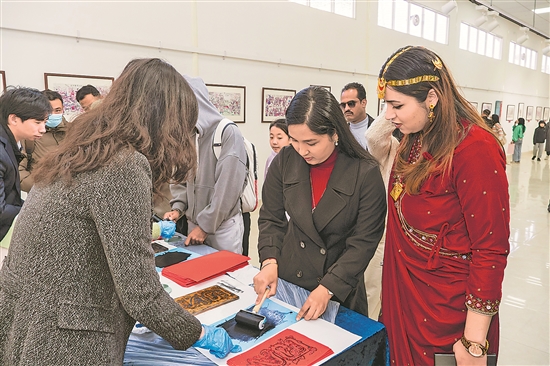 近日,在尼泊爾首都加德滿都,觀眾在年畫展上體驗木版年畫制作。此次年畫展由上海市文化和旅游局及尼泊爾中國文化中心共同主辦,在尼泊爾國家美術院舉行。展覽共展出60幅舊校場木版年畫,展示19世紀后期上海社會世態(tài)、民情風俗以及當時西風東漸的人文氛圍。