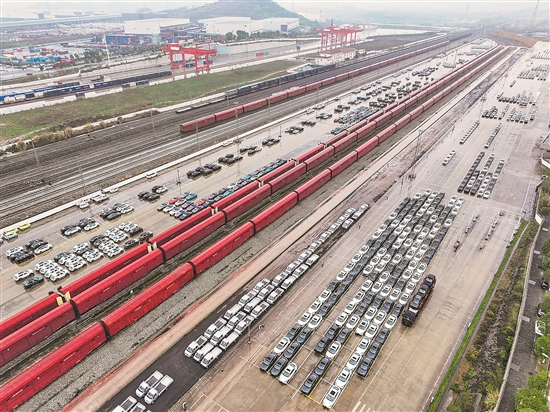 據(jù)介紹,春節(jié)期間每天都有運(yùn)載著“重慶造”整車的班列從魚嘴站出發(fā),借助西部陸海新通道和中歐班列前往東南亞和歐洲市場。新華社記者 唐奕 攝