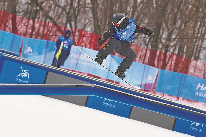 圖為2月8日,中國選手劉昊宇在哈爾濱亞冬會單板滑雪男子坡面障礙技巧的決賽中。本報記者 蔚可任 攝