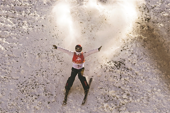 2月10日,在亞布力滑雪場舉行的哈爾濱亞冬會自由式滑雪空中技巧混合團體決賽中,中國隊冬奧冠軍徐夢桃、齊廣璞與20歲小將李心鵬聯(lián)袂出戰(zhàn)。圖為中國隊選手徐夢桃在比賽中。本報記者 蔚可任 攝