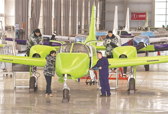近日,在湖北省荊門市漳河新區(qū)一家飛機(jī)制造公司的總裝車間里,技術(shù)人員正在對(duì)飛機(jī)進(jìn)行裝配、點(diǎn)火試車,為交付使用做準(zhǔn)備。