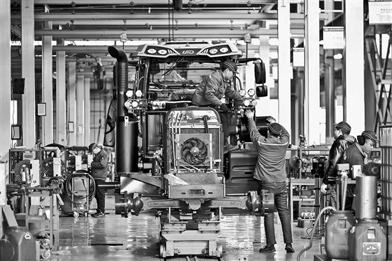 2月9日,工人在山東省青州經(jīng)濟開發(fā)區(qū)一家大馬力拖拉機制造企業(yè)車間內(nèi)裝配作業(yè)。