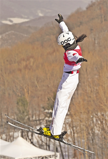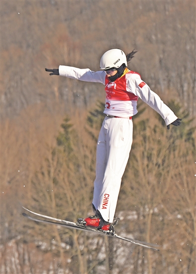 馮俊熙(上圖)/王雪在自由式滑雪女子空中技巧雙人同步?jīng)Q賽比賽中。新華社記者 夏一方 攝