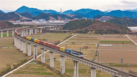 2月11日,浙江省金華市,俯瞰浙江交通集團金溫鐵路永康東站,春節(jié)后首列滿載永康特色產(chǎn)品的海鐵聯(lián)運班列緩緩啟程,駛往寧波舟山港登船出海。今年1月,金溫鐵路永康東站完成貨物到發(fā)13.47萬噸,同比增長43.6%,其中海鐵聯(lián)運發(fā)送集裝箱4758標箱,同比增長20.5%,實現(xiàn)2025年開門紅。本報通訊員 胡肖飛 攝