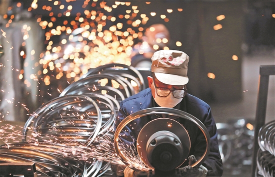 2月11日,在浙江省杭州市臨安區(qū)天目山鎮(zhèn)一家外貿(mào)企業(yè),工人在對(duì)準(zhǔn)備銷往海外的自行車鋼圈進(jìn)行拋光作業(yè)。