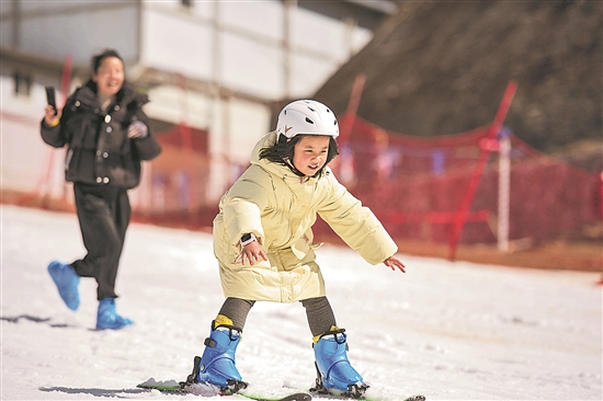 近日,游客在昆明市轎子雪山室外滑雪場滑雪。