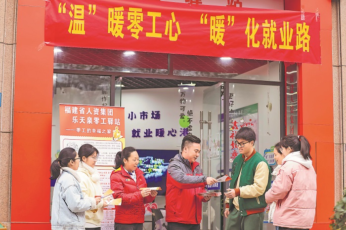 2月13日,在福建省福州市鼓樓區(qū)水部街道樂(lè)天泉社區(qū)零工驛站,求職者正在了解招聘信息。近年來(lái),當(dāng)?shù)爻掷m(xù)推進(jìn)公共就業(yè)服務(wù)體系建設(shè),樹立“政府引領(lǐng)、國(guó)企運(yùn)營(yíng)、市場(chǎng)導(dǎo)向”的工作理念,大力發(fā)展公益性零工市場(chǎng),通過(guò)“線上+線下”融合模式精準(zhǔn)對(duì)接零工需求與用工資源,助力構(gòu)建3公里高效就業(yè)圈。本報(bào)通訊員 謝貴明 攝