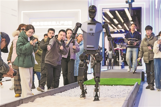 在北京“機(jī)器人大世界”,參觀者在參觀人形機(jī)器人“天工”的行進(jìn)展示(2月24日攝)。