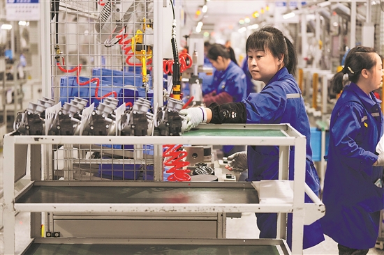 4月7日,在位于浙江省紹興諸暨市店口鎮(zhèn)的浙江萬安科技股份有限公司,工人在汽車零部件裝配檢測線上工作。