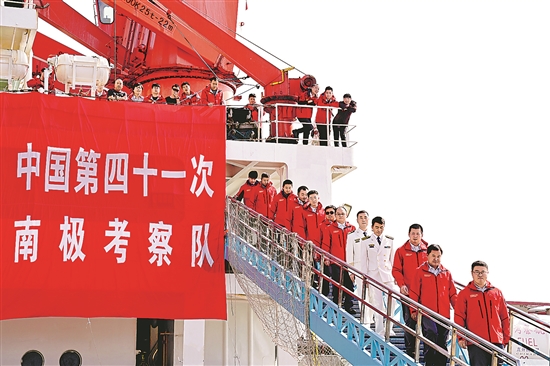 4月8日,中國第41次南極考察隊隊員代表走下“雪龍”號。當(dāng)日,“雪龍”號極地科考破冰船返回上海,中國第41次南極考察隊順利完成主要任務(wù)。