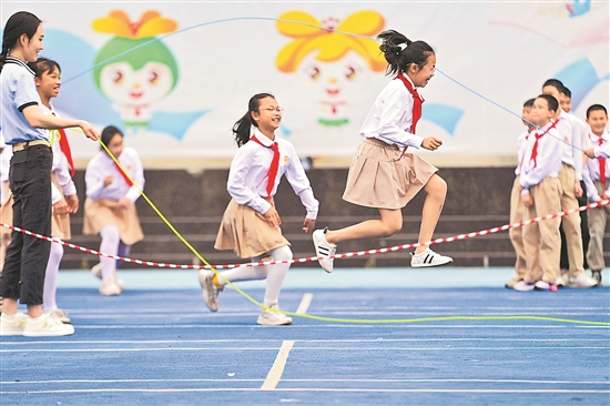 4月10日,學(xué)生們在大課間跳繩。春日里,廣西柳州市潭中路第二小學(xué)總部積極開展豐富多彩的陽光體育大課間活動,讓孩子們在紫荊花盛開的校園里,快樂運(yùn)動,健康成長。新華社記者 黃孝邦 攝