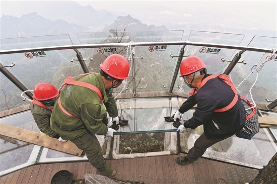 4月8日,施工人員更換玻璃棧道的玻璃。