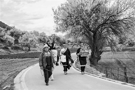 4月3日,西藏自治區(qū)林芝市朵當(dāng)村群眾身著盛裝、手捧切瑪為游客提供民俗體驗(yàn)活動。