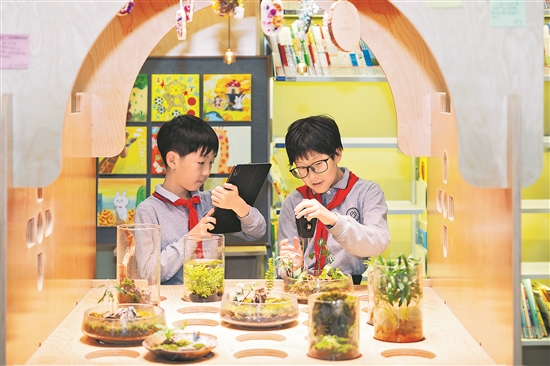 4月11日,在上海師范大學(xué)附屬閔行第三小學(xué)的花香書(shū)院內(nèi),學(xué)生在自然課上觀察植物生長(zhǎng)情況。