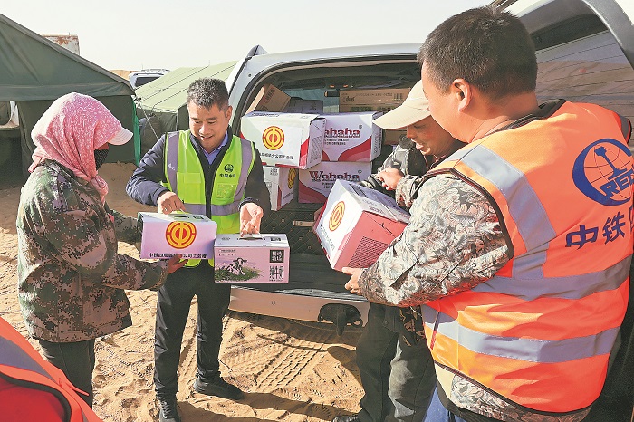 4月12日,中鐵四局城軌分公司工會迅速組織人員將生活必需品送到騰格里沙漠內(nèi)的治沙施工現(xiàn)場。
