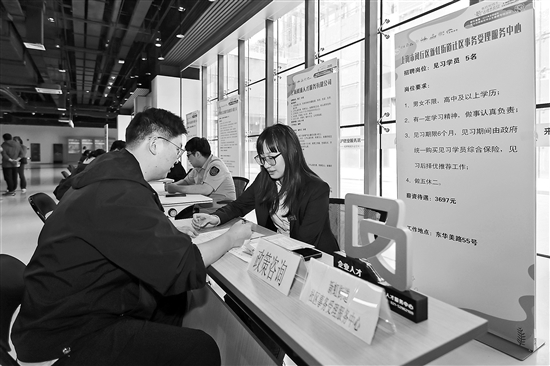 4月8日,求職者(左)在招聘會現(xiàn)場咨詢就業(yè)政策。當日,上海虹橋樞紐樂業(yè)空間舉行4月首場招聘會。該平臺提供“一站式”就業(yè)服務,自運營以來,累計完成求職登記200余人次,接聽就業(yè)咨詢電話600余通,舉辦就業(yè)指導服務活動17場,服務群眾超3000人次。 新華社記者 王翔 攝