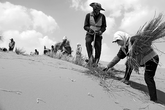 4月10日,位于內(nèi)蒙古自治區(qū)阿拉善盟的巴丹吉林沙漠內(nèi),來自中建一局的工作人員正在鋪設草方格為補種花棒做準備。