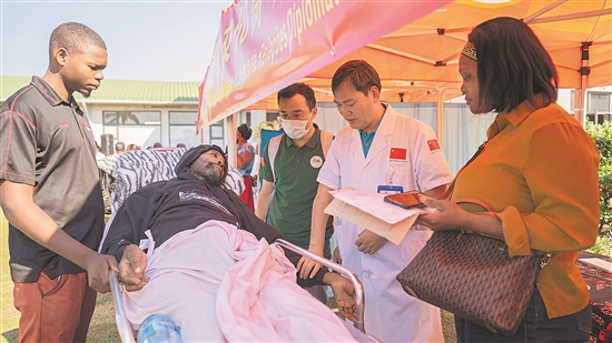 近日,在莫桑比克馬托拉市,第25批中國援莫醫(yī)療隊的醫(yī)生為當?shù)鼐用窳x診。新華社記者 劉杰 攝