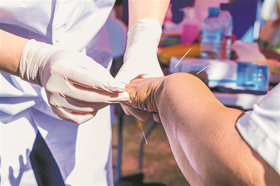 近日,在莫桑比克馬托拉市,第25批中國援莫醫(yī)療隊的醫(yī)生使用針灸療法為當?shù)鼐用窳x診。新華社記者 劉杰 攝