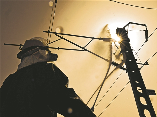 4月16日,中國鐵路青藏集團有限公司西寧供電段格爾木供電車間格爾木接觸網(wǎng)工區(qū)工作人員使用高壓水槍清洗接觸網(wǎng)絕緣子。