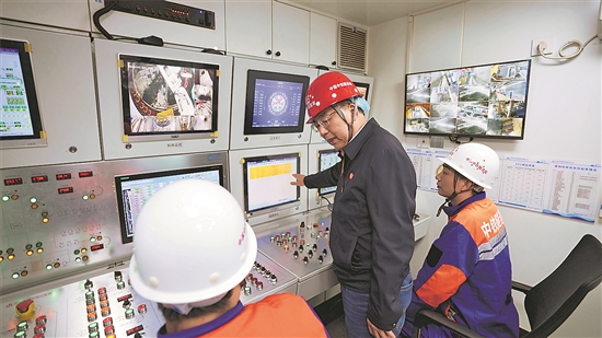 圖為洪開榮在“領(lǐng)航號”盾構(gòu)機中控室內(nèi)就智能掘進情況與現(xiàn)場技術(shù)人員交流。楊婷堯 攝