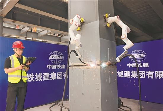 4月21日,在中鐵城建集團(tuán)湘江科學(xué)城交易展示中心項目施工現(xiàn)場,一款輕量化智能焊接機(jī)器人在技術(shù)人員的操控下正在進(jìn)行焊接施工。