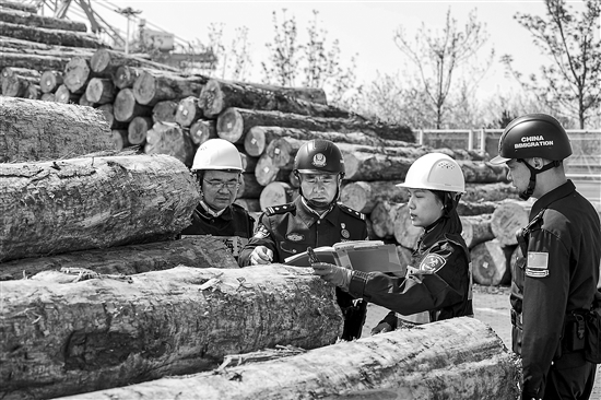 近日,在山東港口日照港嵐山港區(qū),日照出入境邊防檢查站民警和日照海關查驗關員聯(lián)合查驗進口原木。