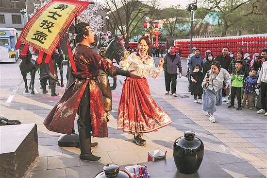 4月24日,北京市延慶區(qū),游客在景區(qū)內(nèi)與演員互動,體驗投壺游戲。