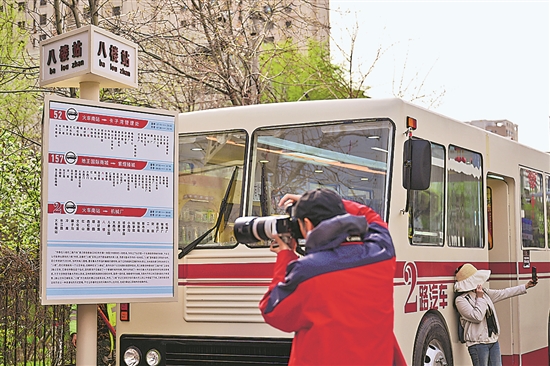 市民在烏魯木齊市八樓公交車站打卡點留影。
