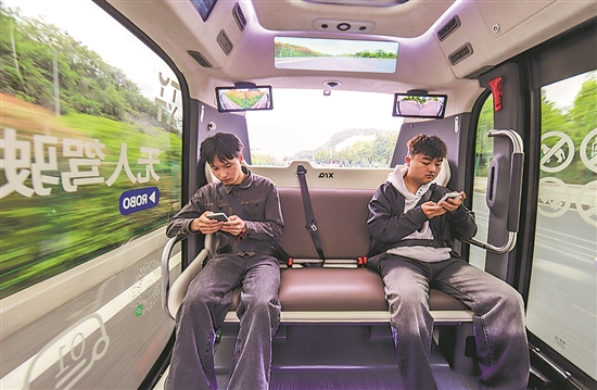 4月24日,參與體驗活動的市民在貴陽市花溪大學城試乘無人駕駛公交車。