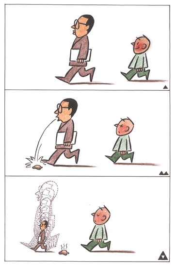 形象,簡單說是人的外表,但進(jìn)一步探究可以帶我們進(jìn)入龐大的邏輯和聯(lián)想空間。漫畫是表現(xiàn)事物特征的視覺形式,它有一個(gè)表達(dá)優(yōu)勢,即善于用簡潔的視覺語言將復(fù)雜的思維軌跡提煉為情節(jié),當(dāng)然,這情節(jié)應(yīng)該是有趣的,能夠引起共鳴的,進(jìn)而引發(fā)深思的。人的形象,可以偉岸也可能卑微,可以高貴也可能猥瑣。人的形象也可以改變,甚至可以反轉(zhuǎn)。一切皆有可能。