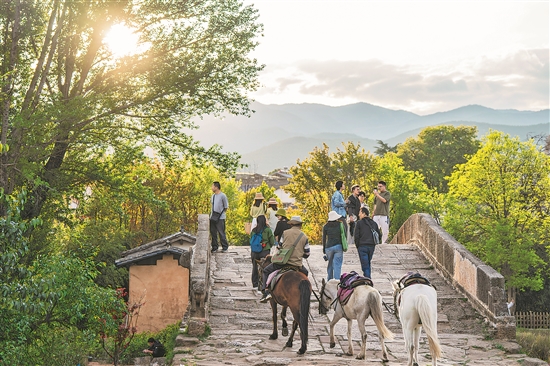 圖為云南省大理州劍川縣沙溪鎮(zhèn)寺登村村民與游客通過玉津橋。
