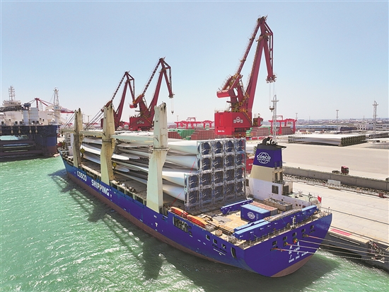 4月14日在江蘇南通通州灣呂四起步港區(qū)通用碼頭拍攝的準備出口的風(fēng)電設(shè)備(無人機照片)。