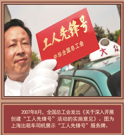 2007年8月,全國總工會發(fā)出《關于深入開展創(chuàng)建“工人先鋒號”活動的實施意見》。圖為上海出租車司機展示“工人先鋒號”服務牌。