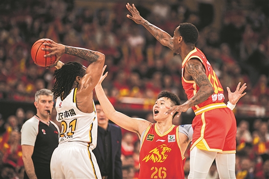 遼寧本鋼隊球員威爾斯(左前)在比賽中受到浙江方興渡隊球員吳驍(右二)、納納利(右一)的包夾防守。新華社記者 江漢 攝