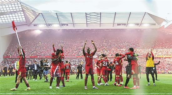 圖為利物浦隊(duì)球員慶祝球隊(duì)提前奪冠。新華社發(fā)