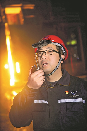 2025年2月13日,全國(guó)勞動(dòng)模范江勇在車間現(xiàn)場(chǎng)指揮220噸冶金行車吊運(yùn)鋼水。