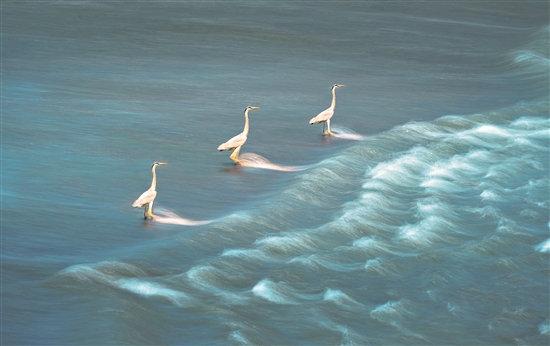 近日,四川成都,一群蒼鷺在九眼橋下的錦江河道逆流方向整齊站立捕魚。