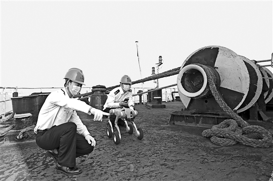 圖為海關關員在船舶甲板測試“機器狗”的機動性和通過性。