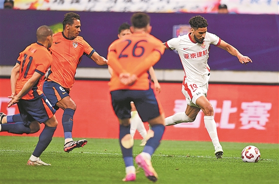 5月5日,長春亞泰隊球員奧莫伊胡安弗(右一)在比賽中帶球突破。新華社記者 李紫恒 攝