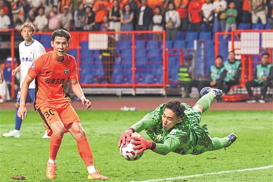5月5日,山東泰山隊守門員于金永(右)在比賽中撲救。新華社發(fā)(彭奕凱 攝)