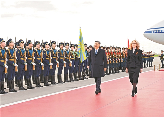 俄方在機場舉行隆重迎接儀式。軍樂團奏中俄兩國國歌。習(xí)近平檢閱儀仗隊并觀看分列式。