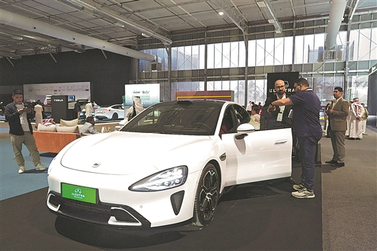 2025沙特新能源車輛及儲能展近日在沙特阿拉伯利雅得開幕,多個中國汽車品牌參展。圖為在沙特阿拉伯利雅得舉辦的展會上,觀眾參觀小米汽車。新華社記者 羅晨 攝