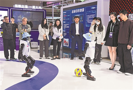 5月8日,機器人在第二十七屆中國北京國際科技產(chǎn)業(yè)博覽會大興展臺展示踢足球。