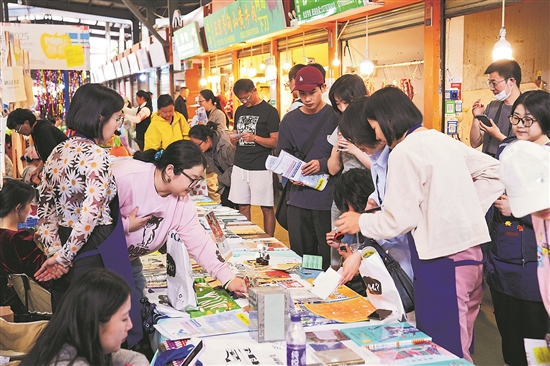 市場內(nèi),200余個(gè)生鮮攤位與40余家書店展位相鄰而設(shè);市場外,“藝術(shù)落入煙火深處”“怪物街市在菜場”“刀鋒圖書獎(jiǎng)特展”“緬甸飲料攤”4個(gè)藝術(shù)展吸引不少市民游客駐足觀賞。
