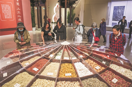 該展覽以非物質(zhì)文化遺產(chǎn)代表性項目為主要載體,以中醫(yī)藥來自人們生產(chǎn)生活實踐,歷經(jīng)創(chuàng)新發(fā)展,又融入現(xiàn)代生活并煥發(fā)活力的脈絡為主線,通過營造坐堂行醫(yī)、古人養(yǎng)生生活、中藥炮制、中醫(yī)藥仿古街區(qū)、百草園等多個空間場景,輔以多媒體交互體驗、非遺技藝展示等方式,讓觀眾體會到中醫(yī)藥文化的博大精深和中醫(yī)藥非遺項目的蓬勃生命力。