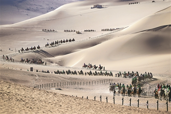 5月10日,游客乘騎駱駝在甘肅省敦煌市鳴沙山月牙泉景區(qū)游覽。