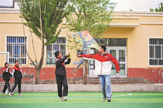 近日,在新疆維吾爾自治區(qū)克州阿圖什市哈拉峻鄉(xiāng)謝依特小學(xué),支教教師麥麥提伊敏·庫迪熱提帶領(lǐng)學(xué)生放風(fēng)箏。